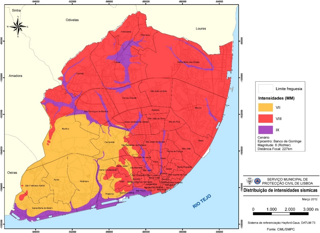 No que respeita à exposição a risco sísmico, Lisboa evidência extrema vulnerabilidade, conforme distribuição de intensidades sísmicas resultantes de um sismo de magnitude 8 na escala de Richter, publicado pelo Serviço Municipal de Proteção Civil de Lisboa.